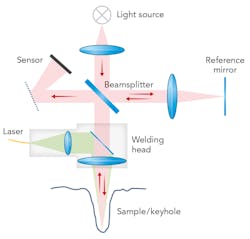 In contrast to sensor technologies, which are typically used in laser materials processing and which determine the process status by utilizing the emissions emerging from beam-material interaction, OCT uses a dedicated light source coupled into the beam path of the processing laser. This allows the measuring position to be set individually, coaxially, or with a slight offset to the processing beam or by using a deflection unit independently. The extremely high measuring frequency enables the use of this technology, even with high-speed laser processes. OCT technology is also called low coherence interferometry, which describes the basic layout of the method, consisting of a reference and measuring path. The difference between both paths can be precisely measured and as the reference path is fixed, the value derived from the system exactly matches the path difference, which is, for example, depth of a keyhole or surface topology in laser powder-bed fusion (LPBF) or in surface ablation processes (FIGURE 1).
