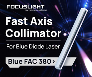 | | Sponsored | | New released! Focuslight's fast axis collimators for high power blue diode laser (Blue FAC 380) have an effective focal length of 0.38mm, a plano-convex design, and is designed for fast axis collimation purposes for high power blue diode laser. |