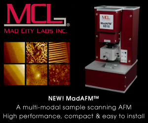 | | Sponsored | | MadAFM™ is a new sample scanning AFM that offers high performance, tabletop design and user friendly features. MadAFM™ is powered by Mad City Labs industry leading nanopositioners giving exceptional precision and performance. MadAFM™ offers over 15 microscopy modes, automated calibration and initialization features, user friendly probe exchange and is simple to install. |