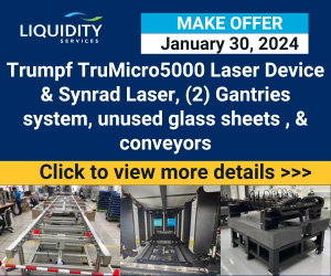 | | Sponsored | | Trumpf TruMicro5000 Laser Device & Synrad Laser, (2) Gantries system, unused glass sheets, conveyors and more from a world leading technology company, available for immediate sale. All machines located in Singapore. Click below to view or contact us for more details. |